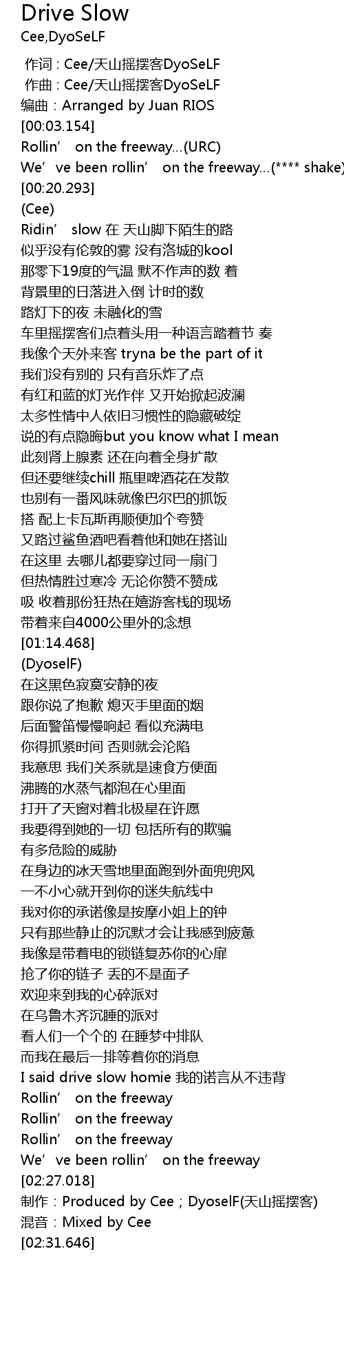 | [02:29.293] | 制作:Produced by Cee;DyoselF(天山摇摆客) |