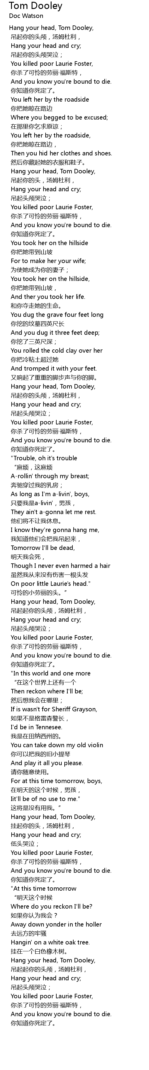 | Hang your head, Tom Dooley, | |