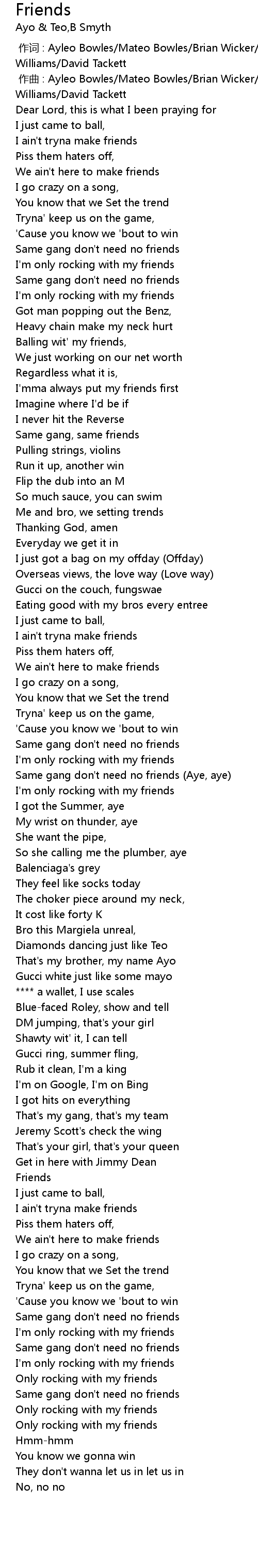 | [01:19.39] | Same gang don't need no friends |