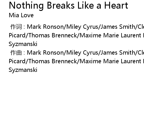 | [00:00.000] | zuo ci : Mark Ronson Miley Cyrus James Smith Clement Marie Jacques Picard Thomas Brenneck Maxime Marie Laurent Picard Ilsey Anna Juber Conor Syzmanski |