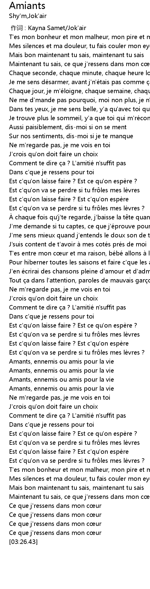 | [00:46.17] | Sur nos sentiments, dis-moi si je te manque |