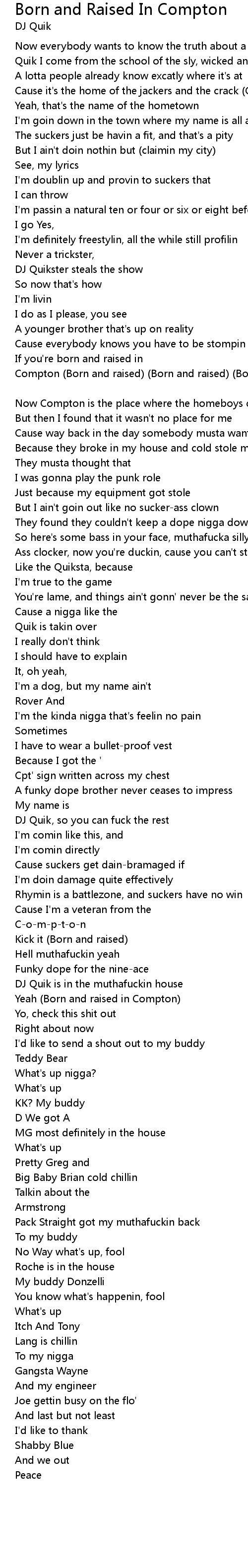 Compton (Born and raised) (Born and raised) (Born and raised in Compton) (Where you from, fool?) (Compton) [ VERSE 2 ] |