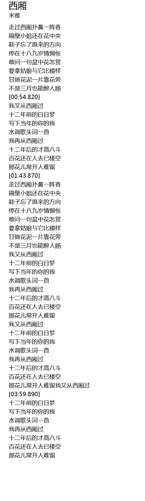 | [00:23.210] | 走过西厢扑鼻一阵香 |