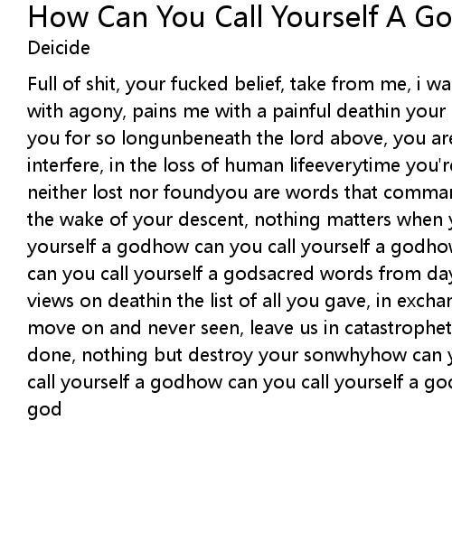 Full of shit, your fucked belief, take from me, i want your headfill my soul with agony, pains me with a painful deathin your myth i hear your dread, hate you for so longunbeneath the lord above, you are just a lielienever once to interfere, in the loss of human lifeeverytime you're needed here, you are neither lost nor foundyou are words that commandeer, making victims reappearin the wake of your descent, nothing matters when you're deaddeadhow can you call yourself a godhow can you call yourself a godhow can you call yourself a godhow can you call yourself a godsacred words from days of old, don't support your views on deathin the list of all you gave, in exchange that we be blessedthen move on and never seen, leave us in catastrophethank you lord for what you've done, nothing but destroy your sonwhyhow can you call yourself a godhow can you call yourself a godhow can you call yourself a godhow can you call yourself a god |