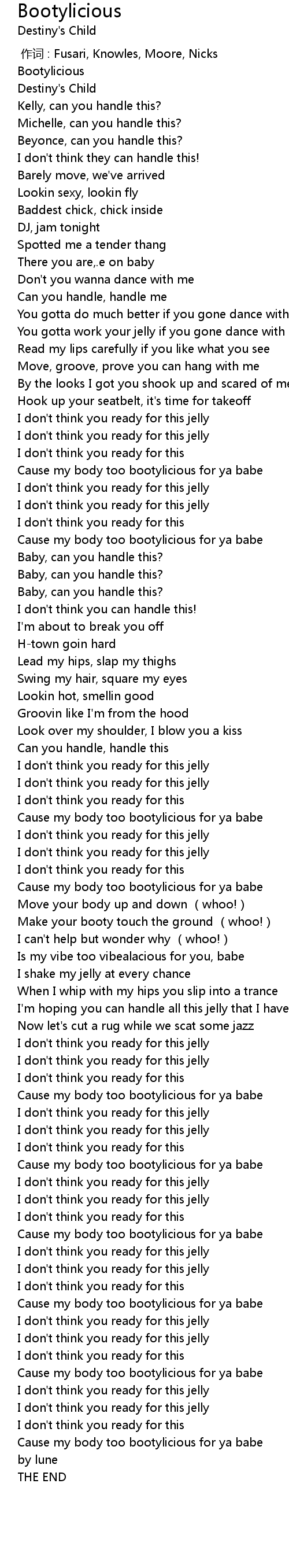 | [02:34.94] | Cause my body too bootylicious for ya babe |