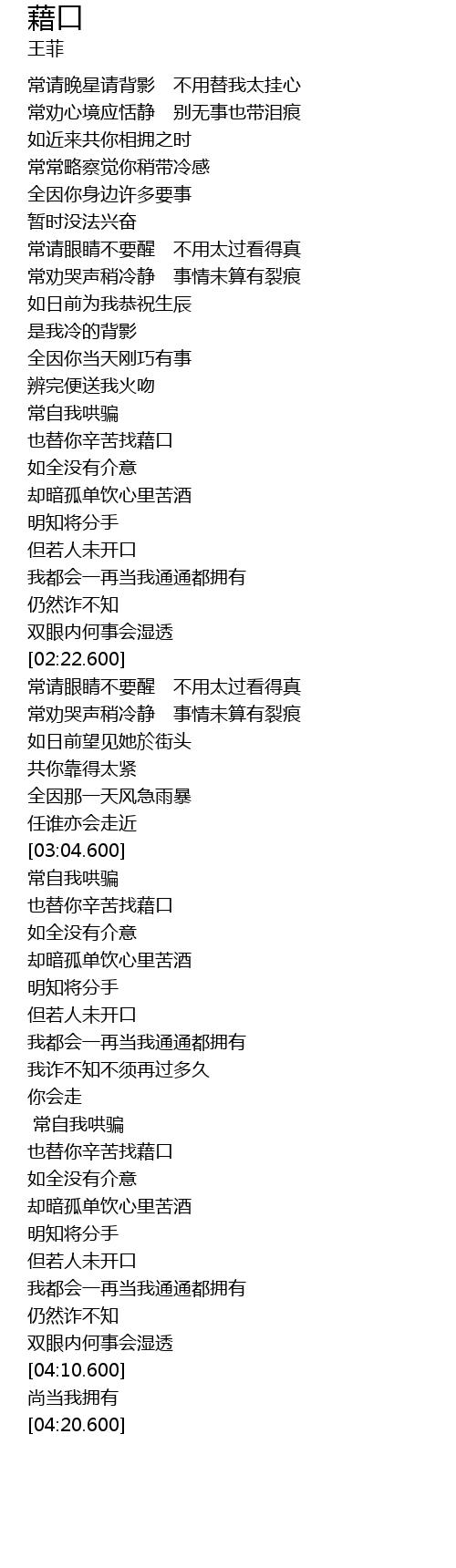 | [03:09.600] | yě tì nǐ xīn kǔ zhǎo jiè kǒu |