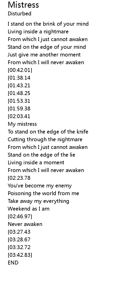 | [03:08.60][01:48.25][00:53.07] | Mistress of whom I idolize |