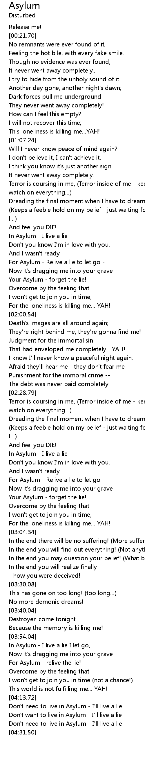 | [04:16.22] | Don't need to live in Asylum - I'll live a lie |