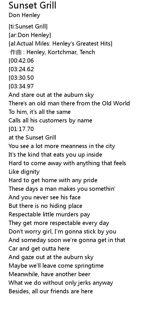 | [00:37.70][03:24.62] | Let's go down to the Sunset Grill |