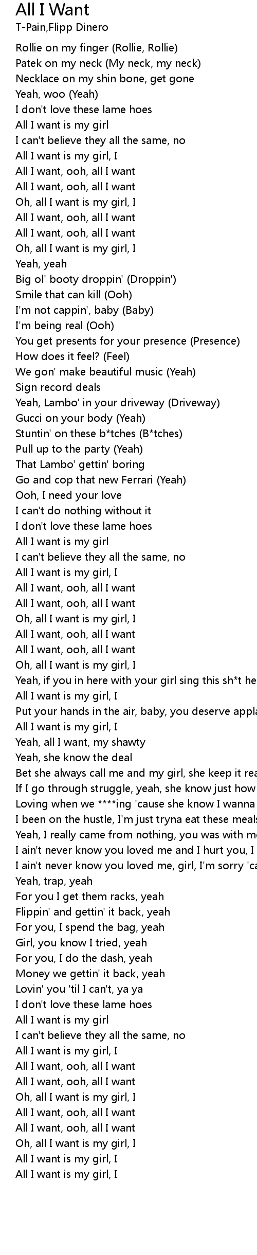 | [01:11.34] | Oh, all I want is my girl, I |