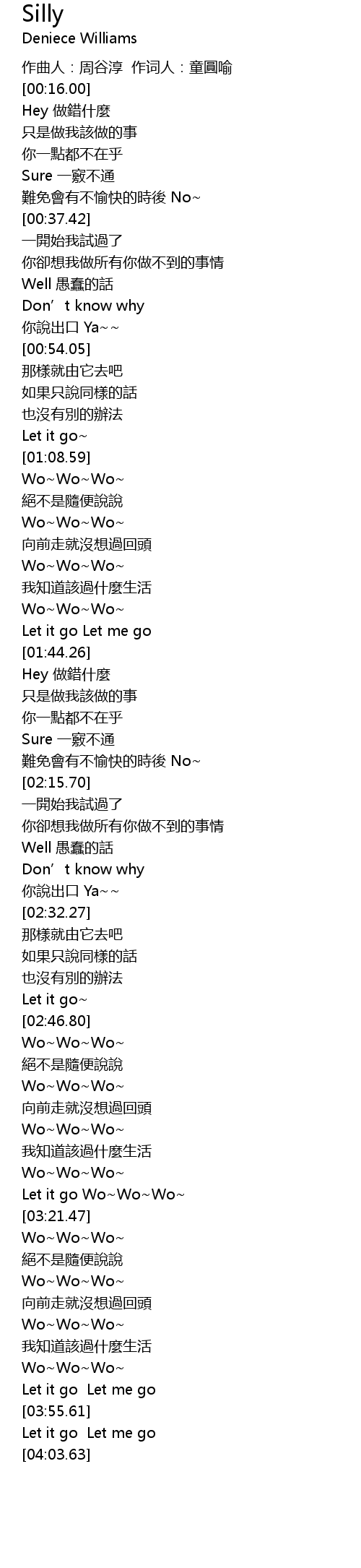 | [03:18.23] | Let it go Wo Wo Wo |