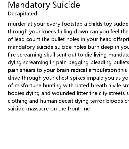 murder at your every footstep a childs toy sudden death sniper blazes you through your knees falling down can you feel the heat burn ambushed by the spray of lead count the bullet holes in your head offspring sent out to cry living mandatory suicide suicide holes burn deep in your chest raked by machine gun fire screaming skull sent out to die living mandatory suicide suicide lying dying screaming in pain begging pleading bullets drip like rain minds explode pain shears to your brain radical amputation this is insane fly swatter stakes drive through your chest spikes impale you as your forced off the crest soldier of misfortune hunting with bated breath a vile smell like tasting death dead bodies dying and wounded litter the city streets shattered glass bits of clothing and human deceit dying terror bloods cheap its everywhere mandatory suicide massacre on the front line |