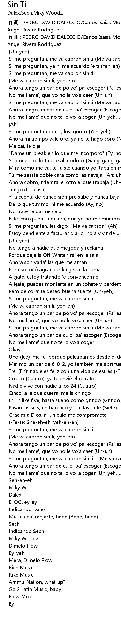 | [02:47.926] | Si me preguntan, me va cabrón sin ti-i (Me va cabrón sin ti) |