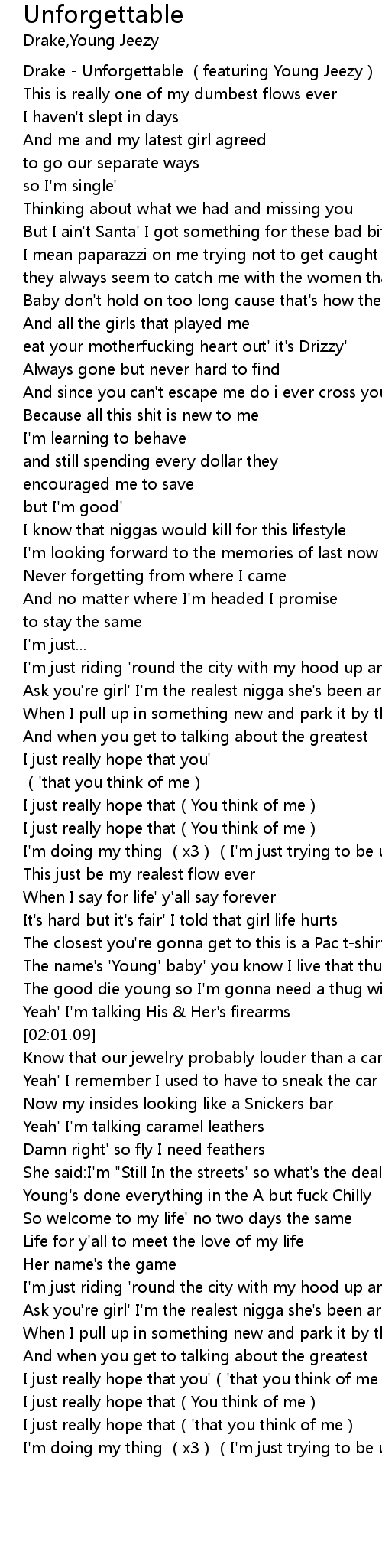 | [00:01.78] | Drake Unforgettable featuring Young Jeezy |