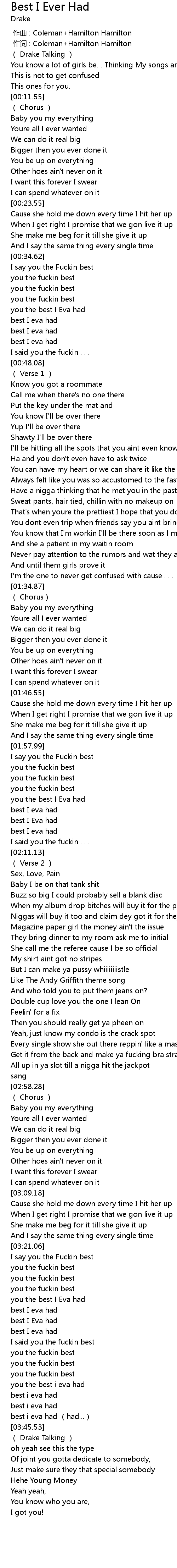 | [01:14.49] | That's when youre the prettiest I hope that you don't take it wrong You dont even trip when friends say you aint bringin Drake along |