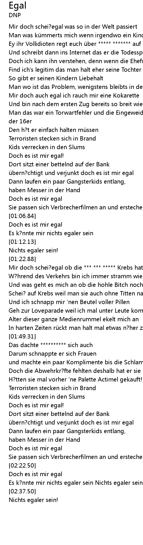 | [02:26.38] | Es k? nnte mir nichts egaler sein Nichts egaler sein! |