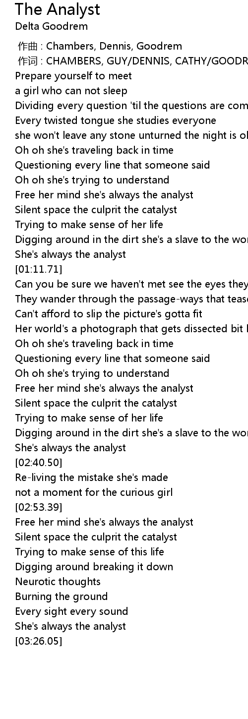 | [01:58.45] | Free her mind she' s always the analyst |