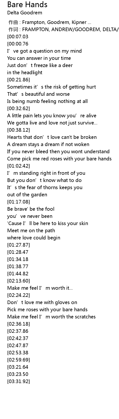 | [02:06.45][01:44.82] | Come pick me red roses with your bare hands |