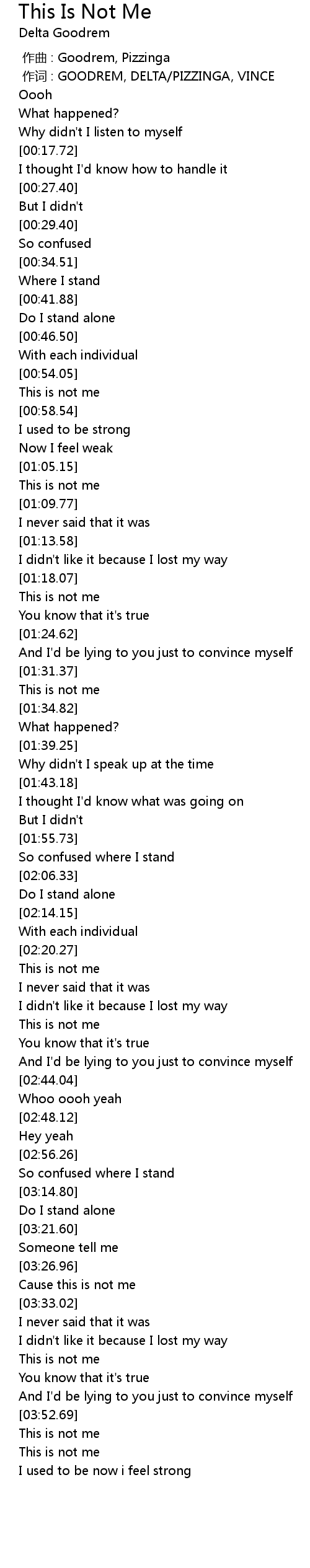 | [00:01.00] | 作词 : GOODREM, DELTA/PIZZINGA, VINCE |