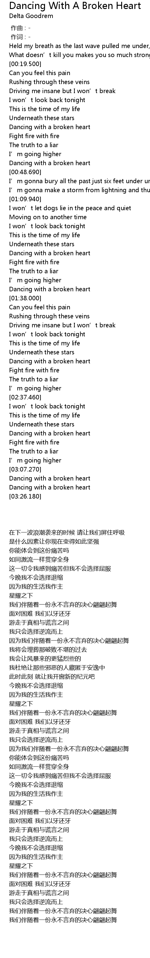 | [01:34.570] | Dancing with a broken heart |