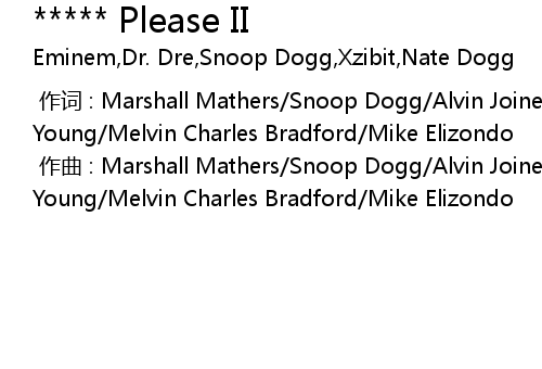 | [00:00.000] | 作词 : Marshall Mathers/Snoop Dogg/Alvin Joiner/Andre R. Young/Melvin Charles Bradford/Mike Elizondo |