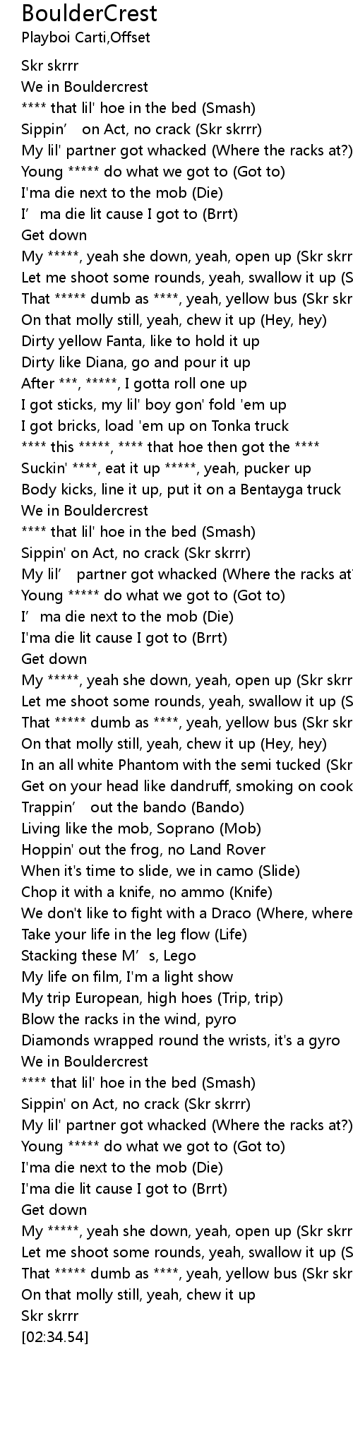 | [02:23.43] | That ***** dumb as ****, yeah, yellow bus (Skr skrrr) |