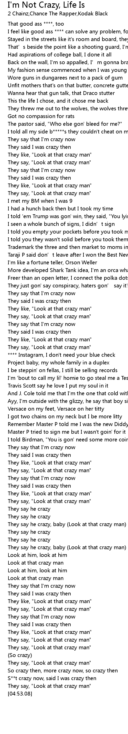 | [04:46.28] | S**t crazy now, said I was crazy then |