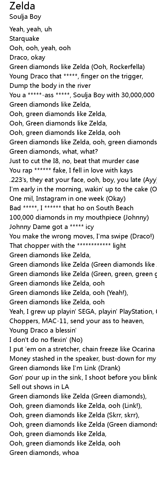 Green diamonds like Zelda, ooh, green diamonds like Zelda, ooh |