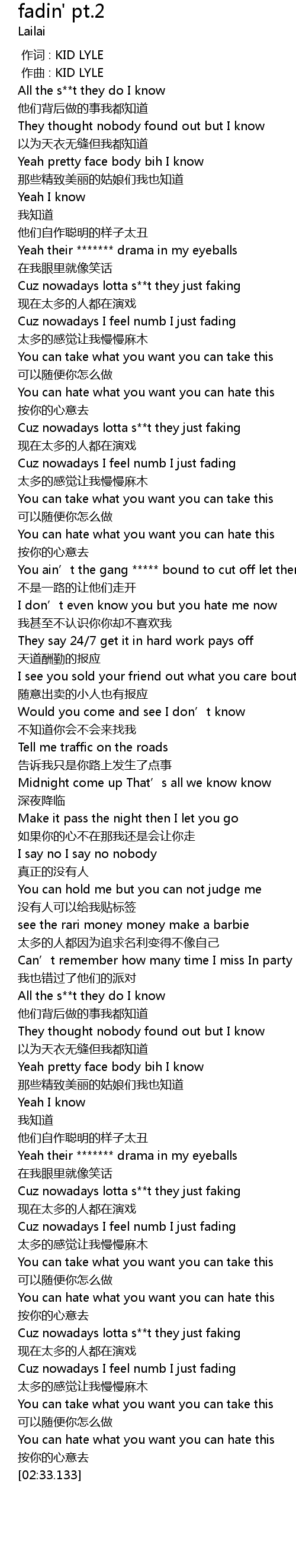 | [00:50.163] | Cuz nowadays lotta s**t they just faking |