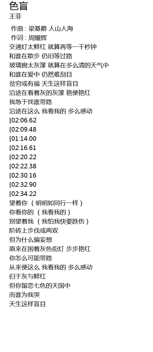 | [01:04.67][02:16.61] | 慢慢踏在我的色盲途中 |