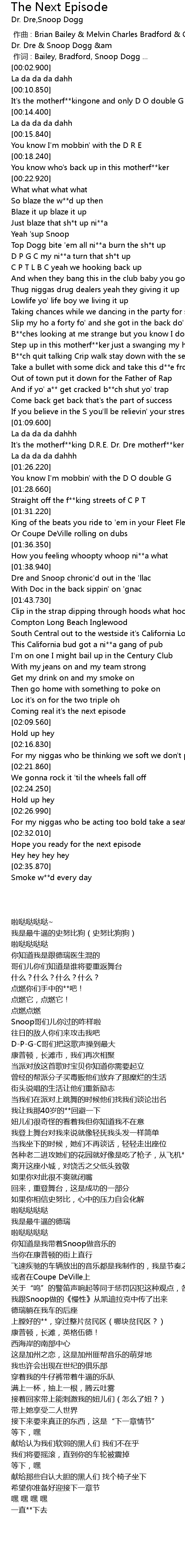 | [01:21.870] | It's the motherf**king D.R.E. Dr. Dre motherf**ker |