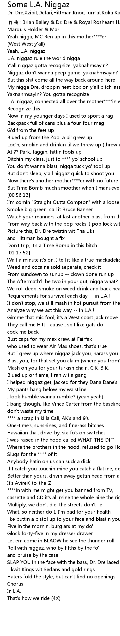 | [00:21.43] | L.A. niggaz, connected all over the mother****in world, nigga |