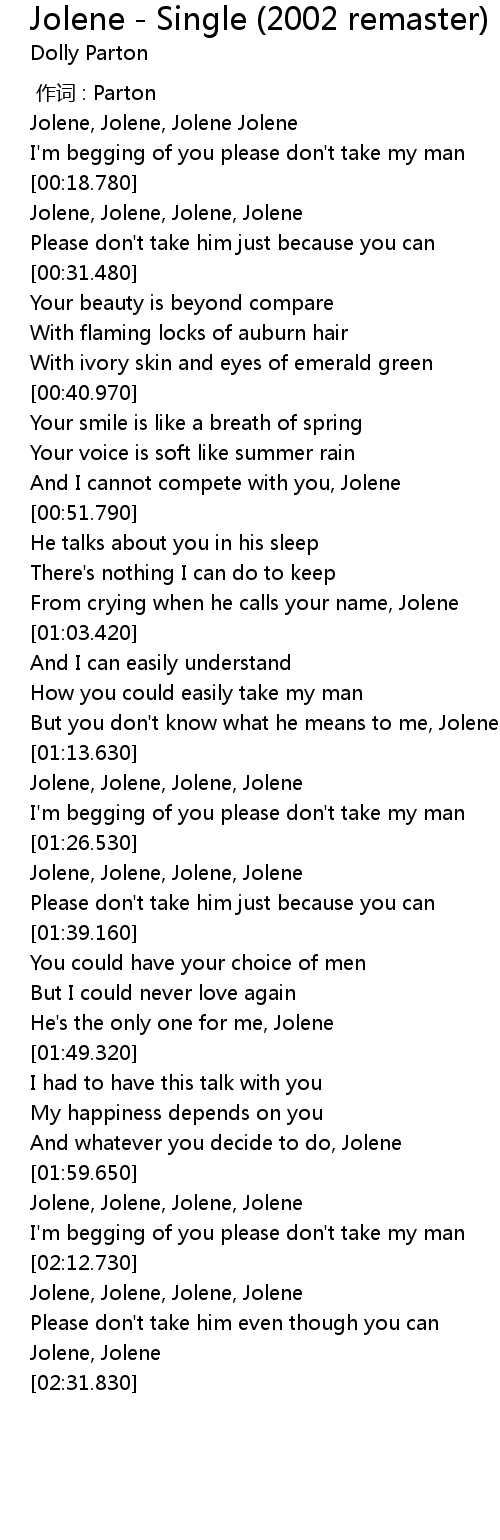 | [02:02.160] | Jolene, Jolene, Jolene, Jolene |