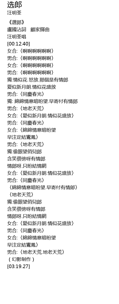 | [01:41.67] | 獨:偷眼望俏兒郎 |
