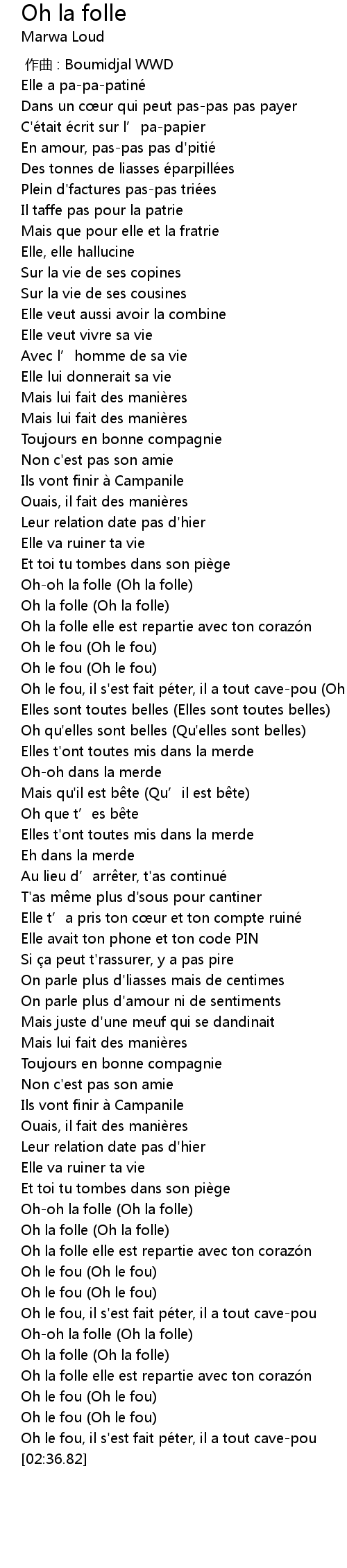 | [02:20.62] | Oh-oh la folle (Oh la folle) |