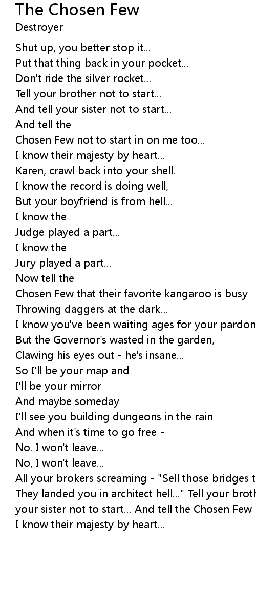 They landed you in architect hell..." Tell your brother not to start... And tell your sister not to start... And tell the Chosen Few not to start in on me too... I know their majesty by heart... |