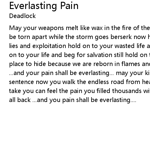 May your weapons melt like wax in the fire of the burning skies. may your armies be torn apart while the storm goes berserk now hold on to your life built on lies and exploitation hold on to your wasted life and pray to your god you hold on to your life and beg for salvation still hold on to your life there is no place to hide because we are reborn in flames and purified in our own blood ...and your pain shall be everlasting... may your kindred watch us pronouncing sentence now you walk the endless road from heaven to hell with every step you take you can feel the pain you filled thousands with sorrow and now you get it all back ...and you pain shall be everlasting.... |
