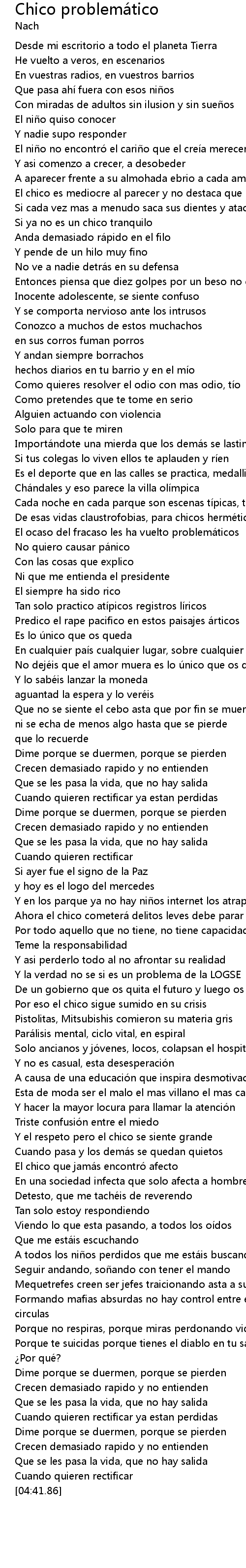 | [00:40.27] | Si ya no es un chico tranquilo |