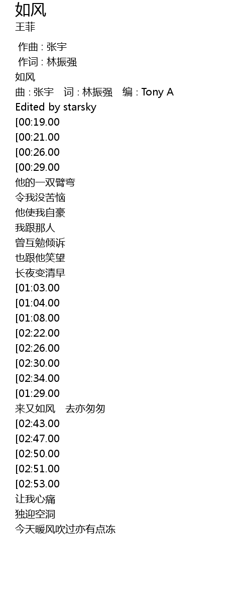 | [00:10.00] | 曲∶张宇 词∶林振强 编∶Tony A |