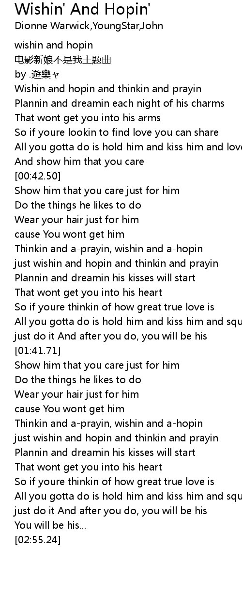 | [01:59.97] | Thinkin and aprayin, wishin and ahopin |