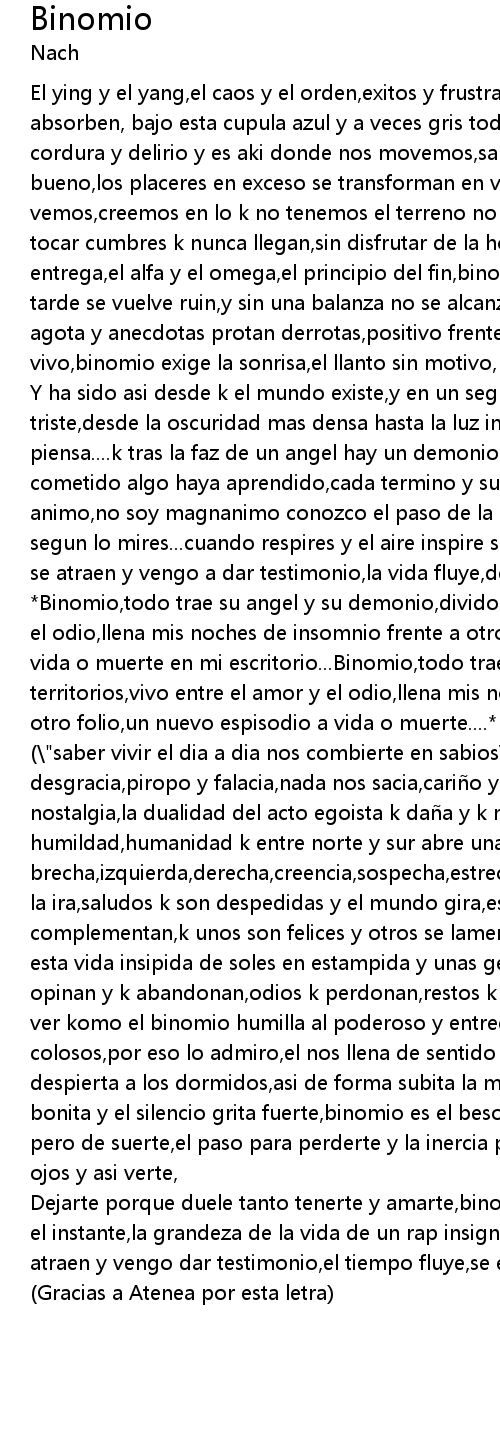 | Dejarte porque duele tanto tenerte y amarte,binomio es el arte de hacer eterno el instante,la grandeza de la vida de un rap insignificante,los opuestos se atraen y vengo dar testimonio,el tiempo fluye,se escabulle y huye...binomio.... | |
