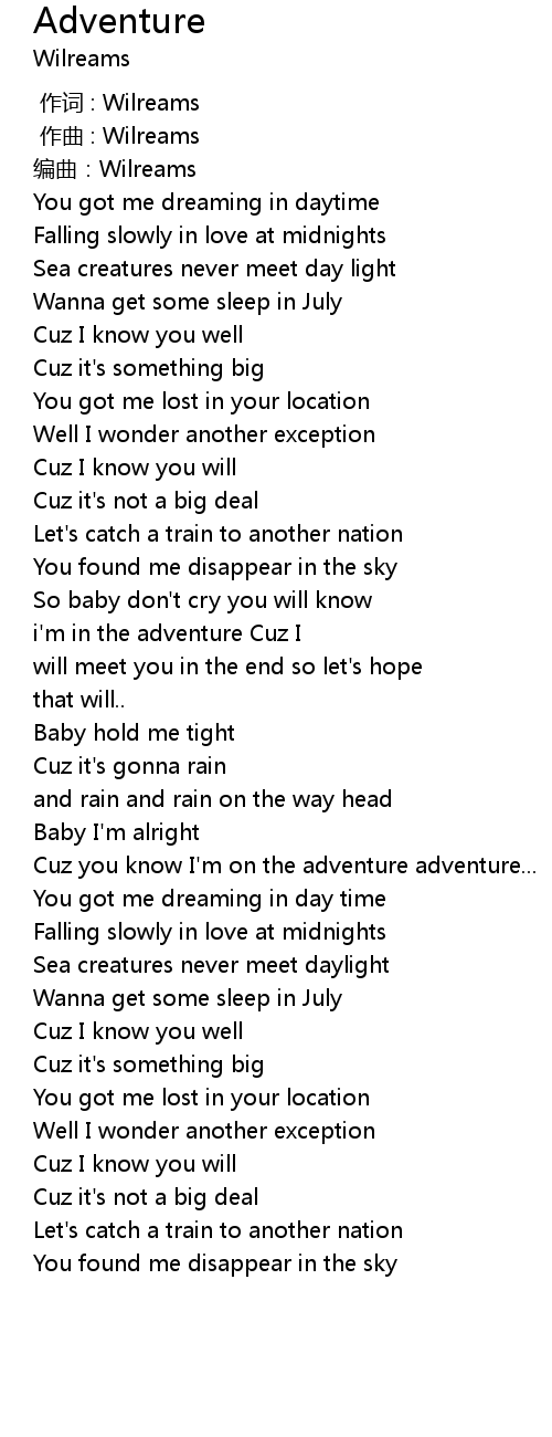 | [02:18.405] | Cuz you know I' m on the adventure adventure... |