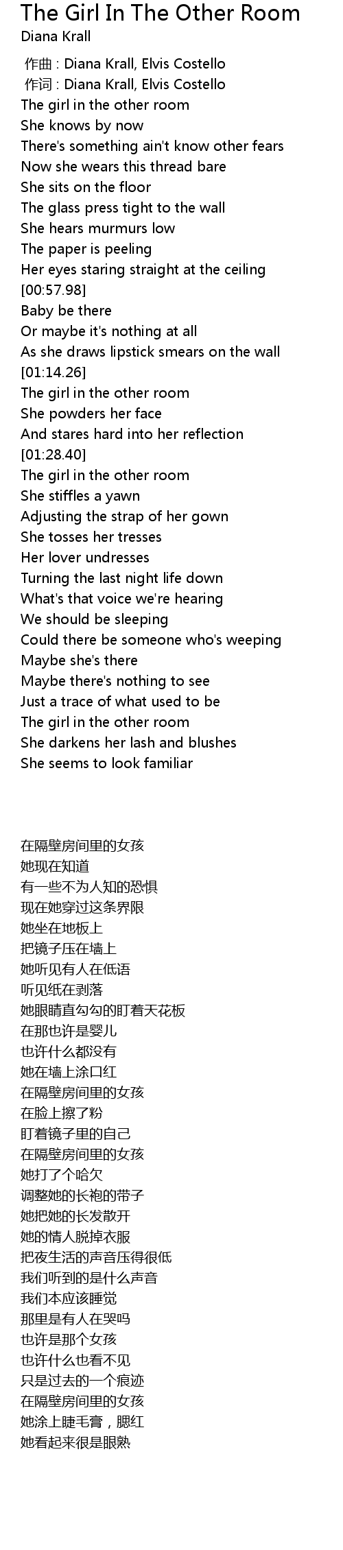 | [00:01.00] | zuò cí : Diana Krall, Elvis Costello |
