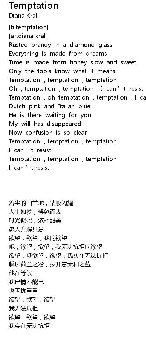 | [01:15.91] | Temptation , oh temptation , temptation , I can ' t resist |