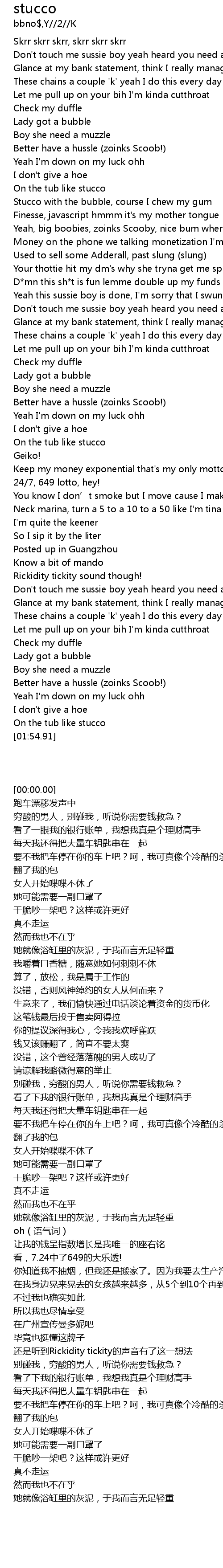 | [00:30.34] | Stucco with the bubble, course I chew my gum |
