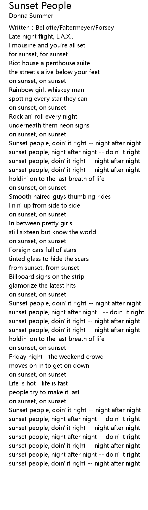 | Sunset people, doin' it right night after night | |