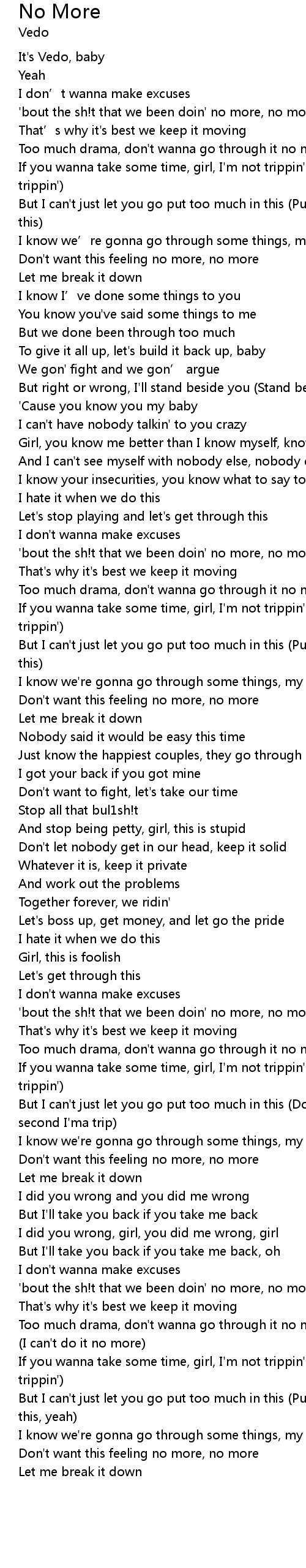 | [00:24.438] | 'bout the sh!t that we been doin' no more, no more |