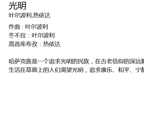 | 生活在草原上的人们渴望光明,追求康乐、和平、宁静的生活。《光明》即是表达这种源远流长的生活信念,并祝福世间众生都能享受光明、万物和谐相处,愿光明永不流逝。 |