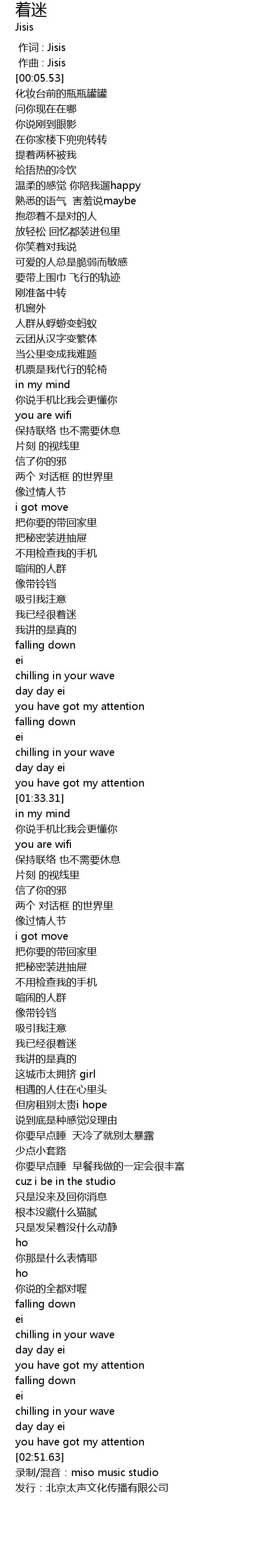 | [02:52.63] | 录制/混音:miso music studio |