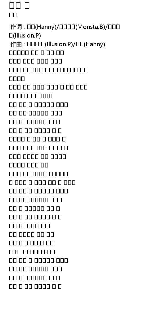 作词 : 해니(Hanny)/몬스타비(Monsta.B)/일루션 피(Illusion.P) |
